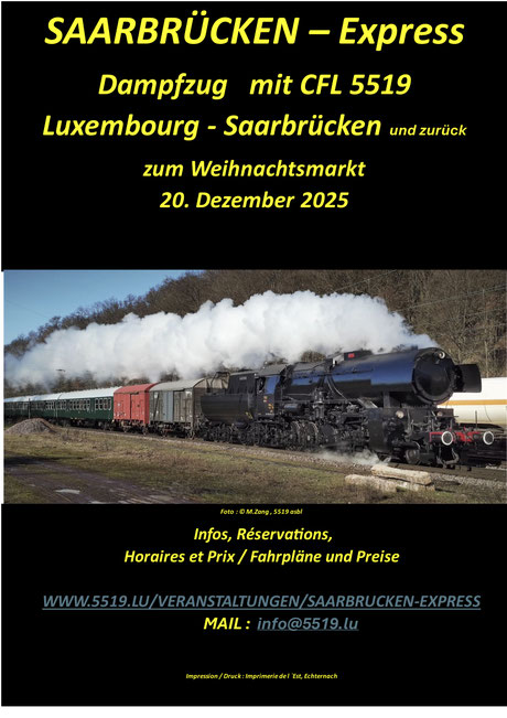 Wichtig!!! Die genauen Fahrzeiten können aus fahrplantechnischen Gründen erst drei Tage vor Abfahrt mitgeteilt werden. Informieren Sie sich auf www.5519.lu