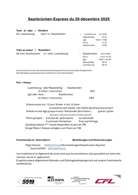 Traditionsgemäß werden wir am 20. Dezember 2025 zum Christkindlmarkt nach Saarbrücken fahren. Die Abfahrt in Luxemburg ist gegen 9:24 Uhr geplant, die Ankunft in Saarbrücken wird gegen 12:50 Uhr sein. Dort können Sie weihnachtliches Ambiente genießen bis zur Rückfahrt gegen 16:53 Uhr.